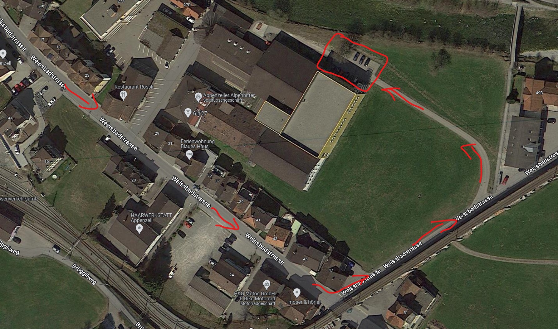 Zufahrt via Weissbadstrasse, vor der Eisenbahnbrücke links abbiegen