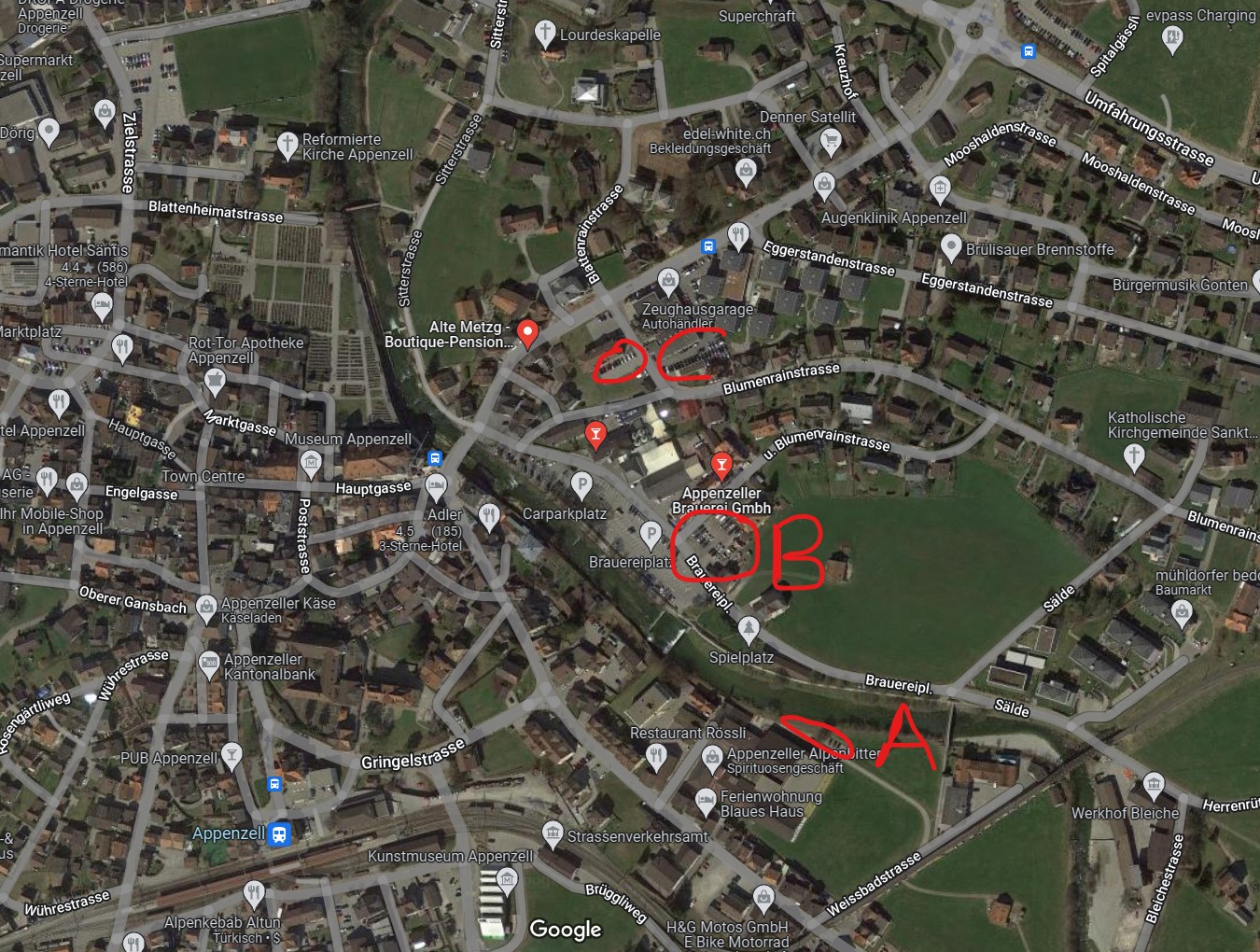 Besucher der Tour 2 (Appenzeller Alpenbitter) können den Parkplatz A benutzen. Es sind ca. 17 Parkplätze dort vorhanden. Wenn der Platz voll ist, bitte auf den nächsten Parkplatz ausweichen.